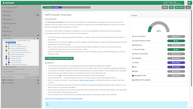The UKFS Checker is designed to enable you to carry out a sustainability self-assessment of your woodland stewardship against the UK Forestry Standard. A total of 36 questions assess your knowledge, planning and management against the Standard. Once completed, you can download a detailed report of your progress from entry through five levels towards Gold certification, along with a certificate showing your rating.